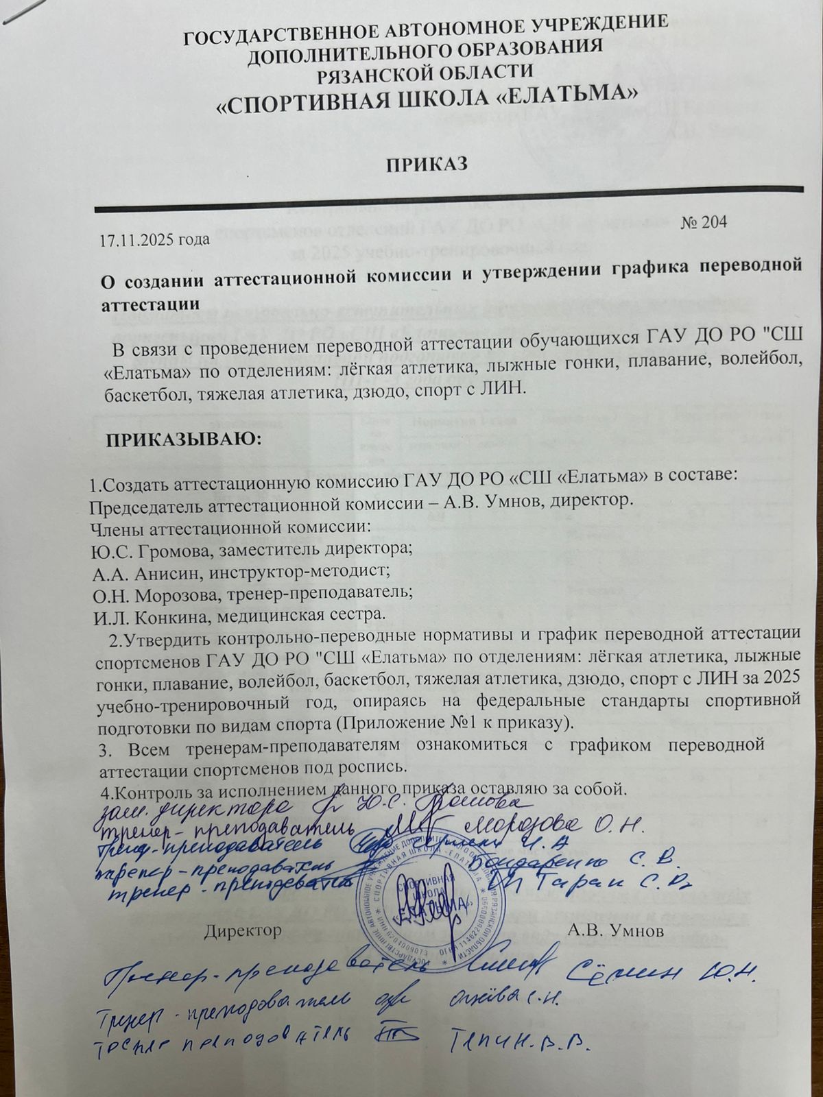 Документы о присвоении квалификационных категорий тренерам и назначении аттестационной комиссии